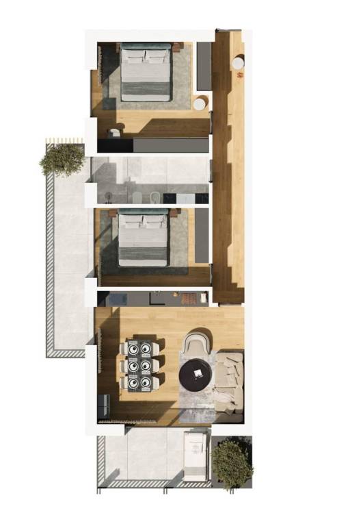 The apartment impresses with its bright living area featuring an open-plan kitchen and direct access to the terrace, creating the perfect space for relaxation. Two comfortable bedrooms offer access to the spacious terrace, providing a cozy and inviting atmosphere. The large, well-lit bathroom with a window ensures excellent natural ventilation. Additionally, the apartment includes a large basement of approximately 5 m², offering versatility and ample storage space.