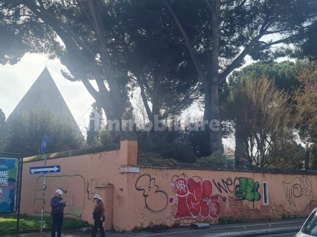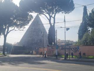 All'interno del giardino privato si accede tramite una scala esterna ad un balcone, potenzialmente ampliabile, dal quale si gode di una vista di rara bellezza sul parco del cimitero acattolico e sulla piramide di Caio Cestio.