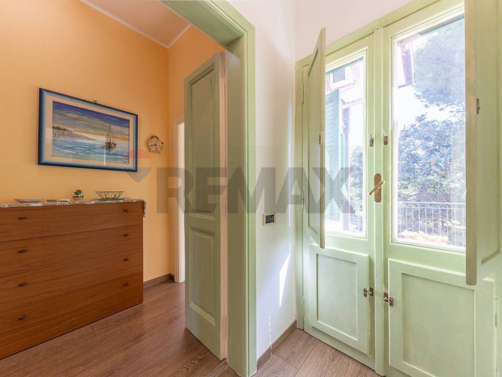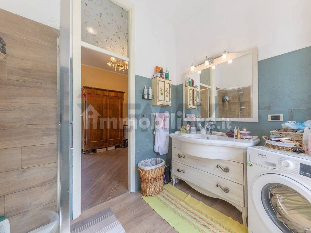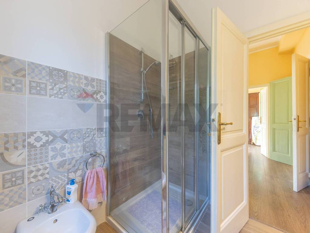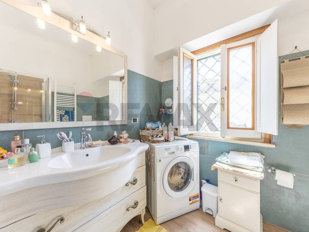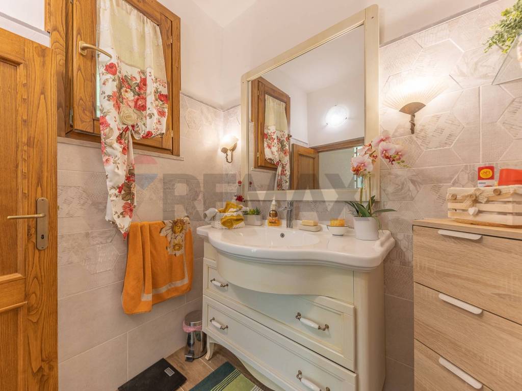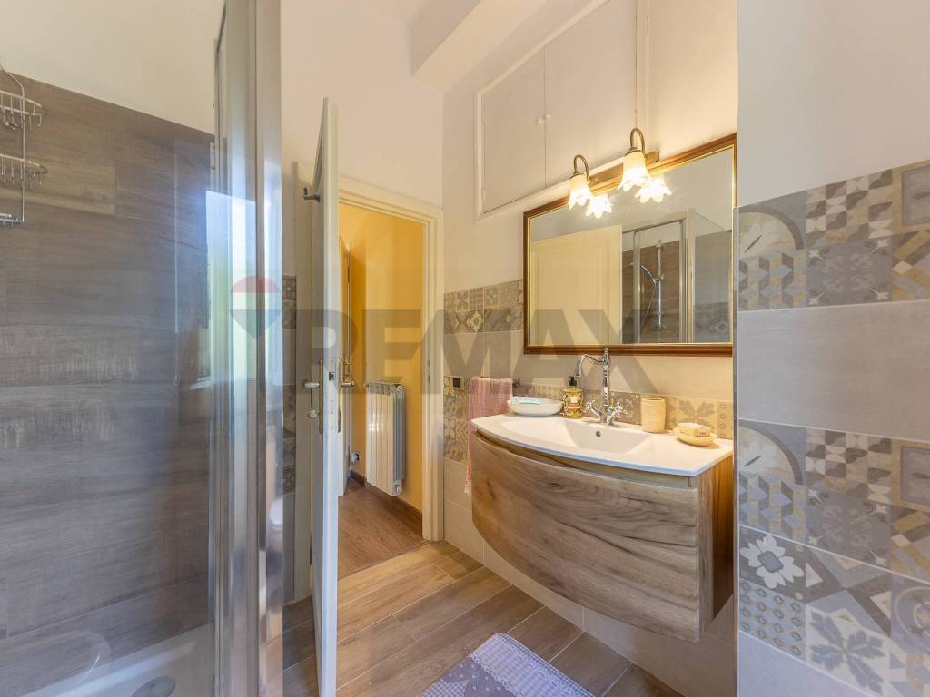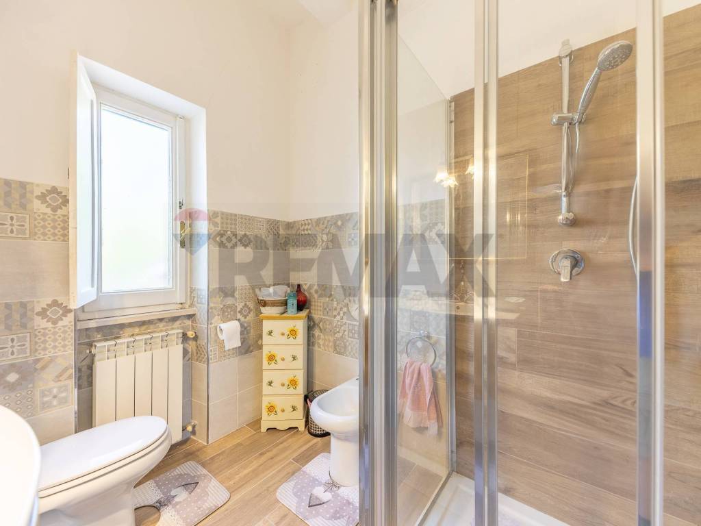 Nel disimpegno che ci conduce al piano superiore troviamo il primo bagno ampio e dotato di tutti i confort .
