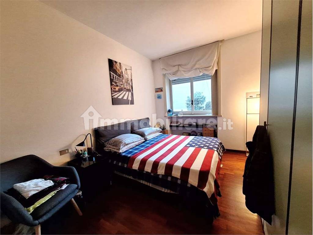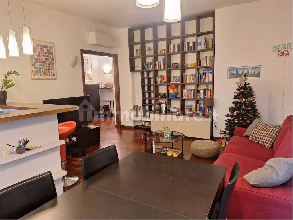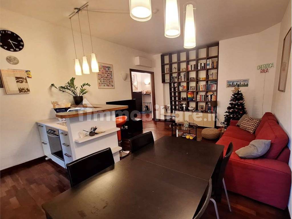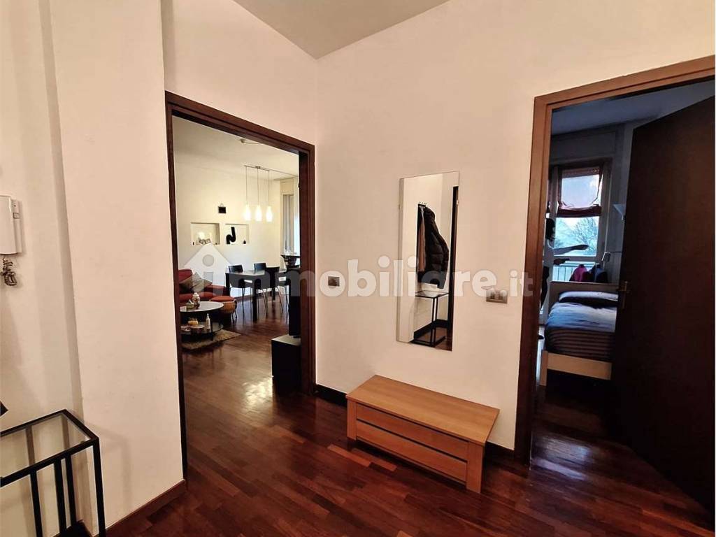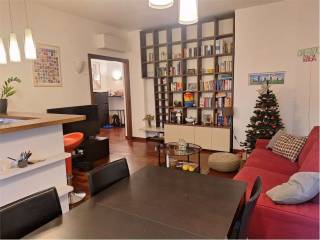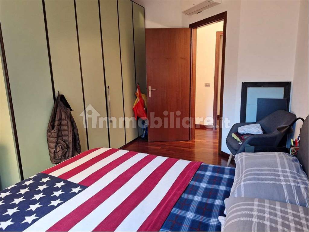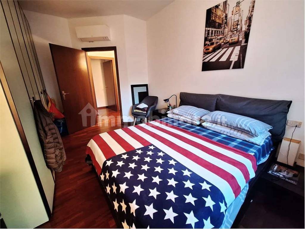 L' appartamento è composto da: ingresso, soggiorno con cucina all'americana, camera da letto matrimoniale, cameretta, bagno, ripostiglio e due balconi. Videocitofono. Pavimenti in parquet. Aria condizionata. Riscaldamento centralizzato a pavimento.