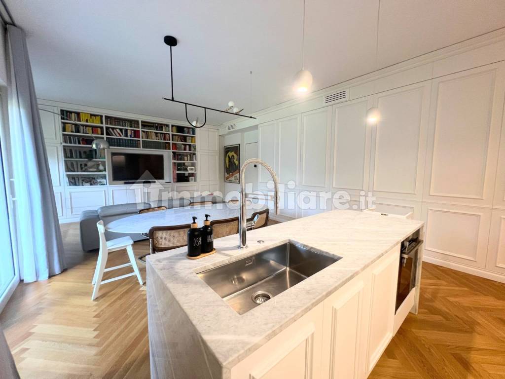 Il living è uno spazio fluido e funzionale, caratterizzato da una cucina su misura con isola e un affaccio diretto sul balcone e sul verde circostante.