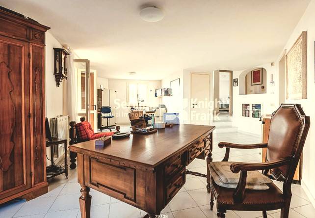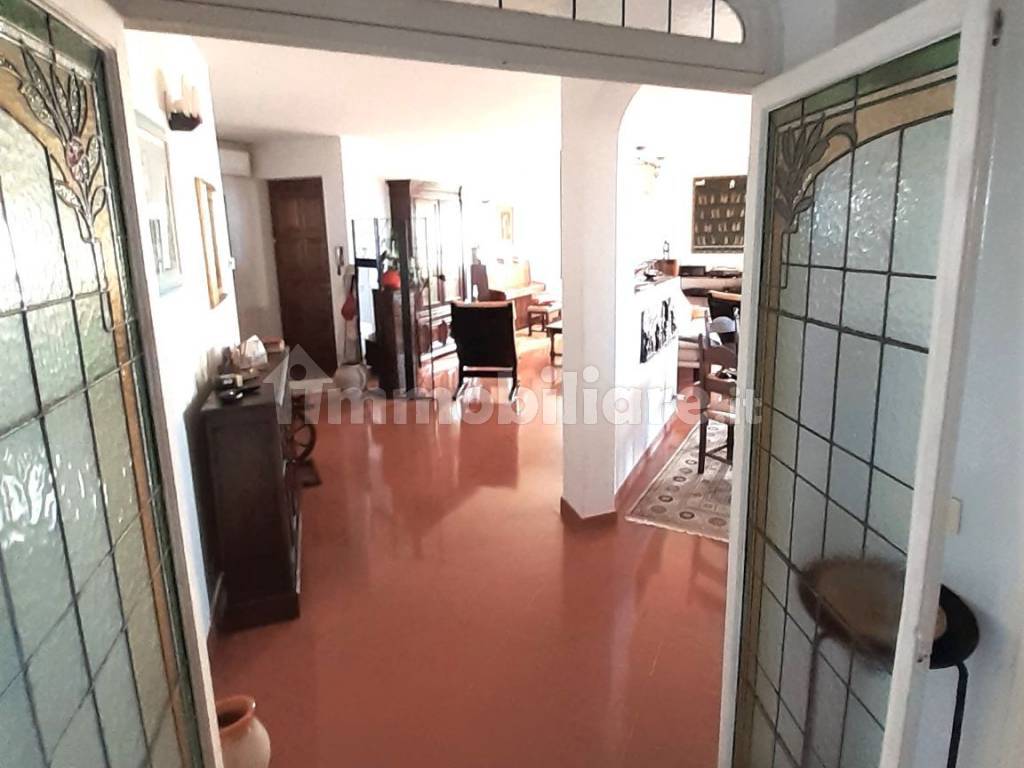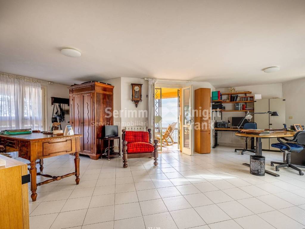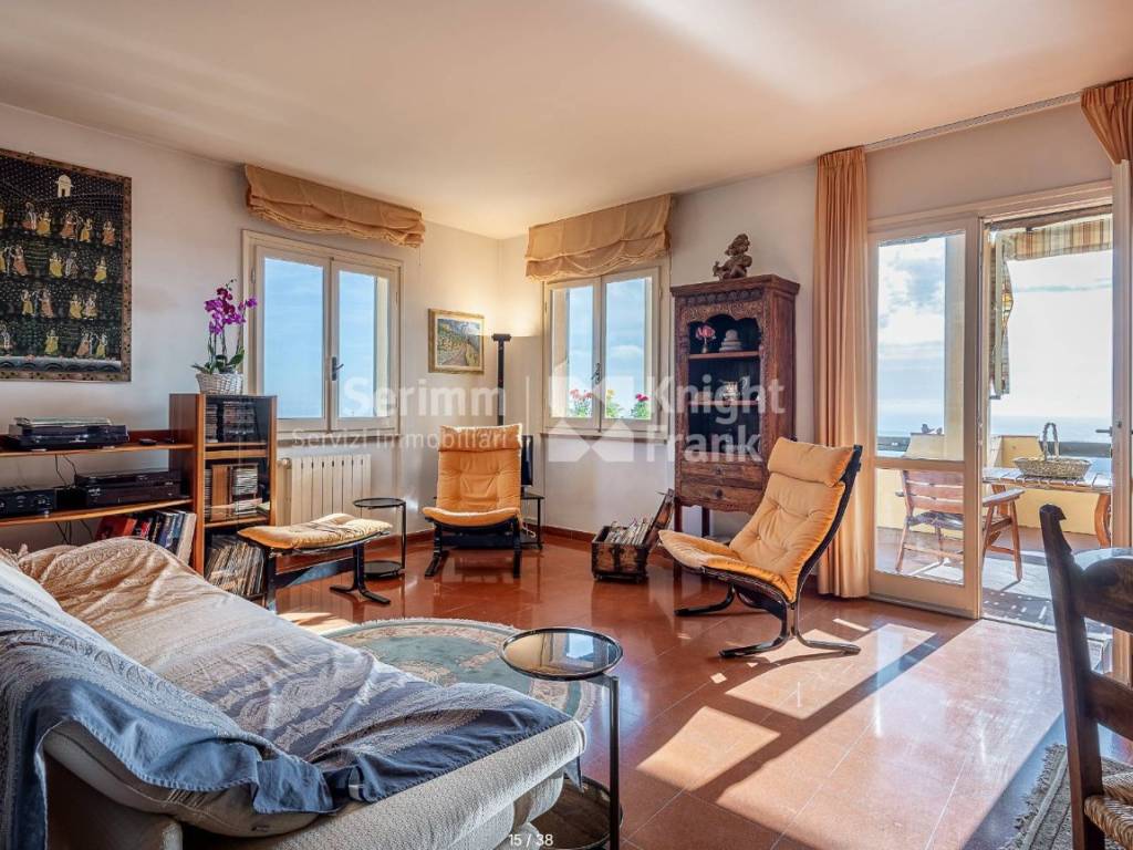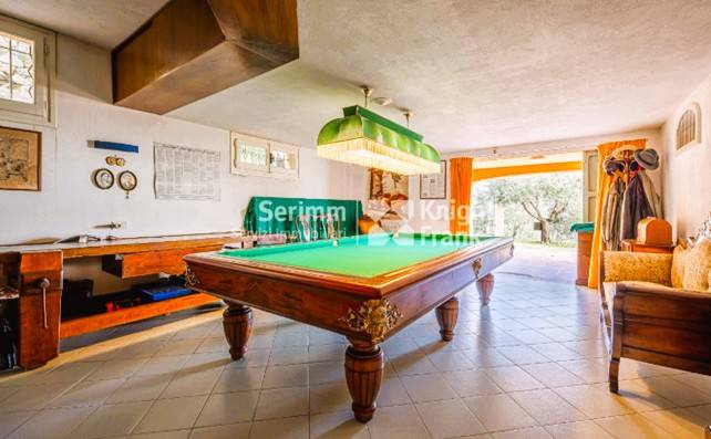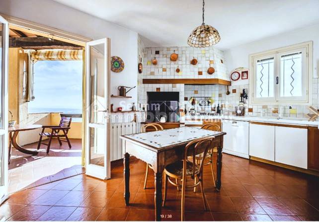 Piano terra: ampio studio con accesso autonomo dall’attigua loggia, soggiorno con accesso diretto nella bella grande veranda affacciata su mare e oliveto, camera tripla, bagno, locale lavanderia/caldaia con stenditoio, cantina/dispensa, bunkerino allarmato, biblioteca con biliardo con accesso diretto anche dalla loggia e dal parcheggio interno attiguo a secondo parcheggio per 3 vetture.