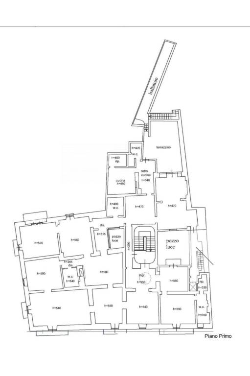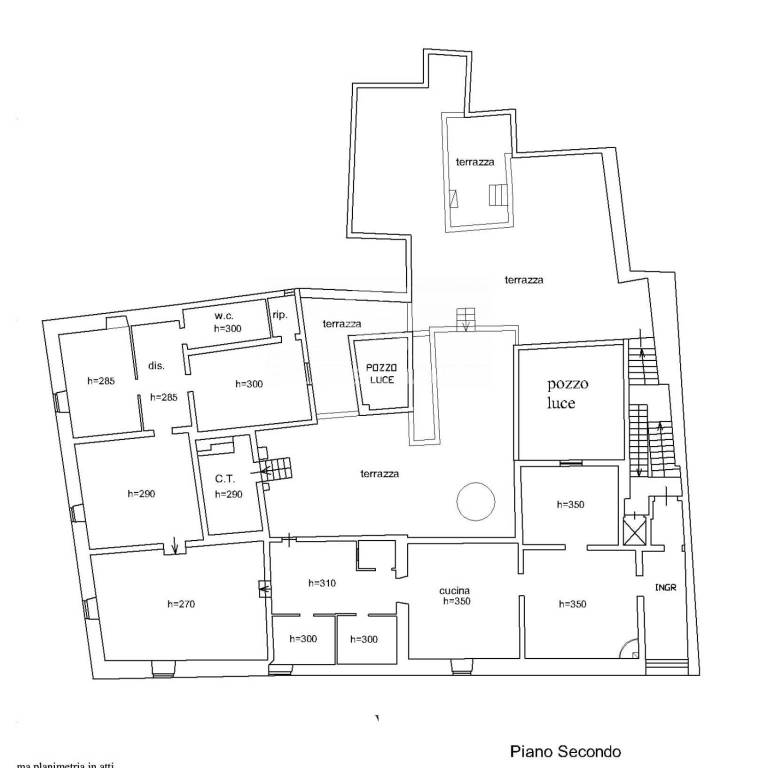 Dall'androne coperto, protette da due cancelli, si diramano due ampie scale parallele che raggiugono i due piani superiori che, insieme alle scale del giardino, costituiscono svariati punti di accesso all'interno dell'immobile rendendolo così facilmente divisibile in unità indipendenti. Un ulteriore punto di accesso è costituito dall'elevatore al piano terra che raggiunge ogni piano.