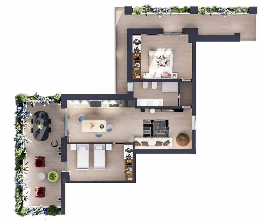 El complejo ofrece dos prestigiosos áticos: el Ático Uno y el Ático Dos, ambos con garaje privado y puntos de recarga para vehículos eléctricos. Los dos áticos pueden combinarse para crear una solución única, de gran prestigio y privacidad.