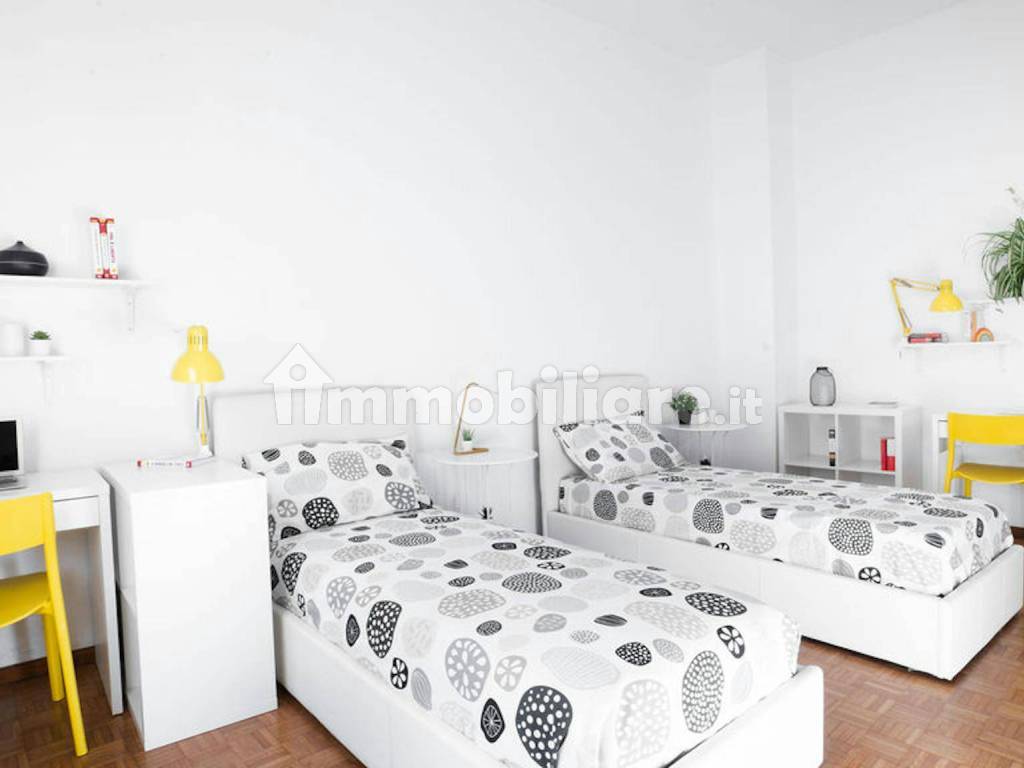 it is equipped with a comfortable container bed with memory mattress, desk and comfortable chairs for many hours of study or work from home, bookcases and TV. Very large wardrobe. inside the room, there is a characteristic reading area in the bow window.