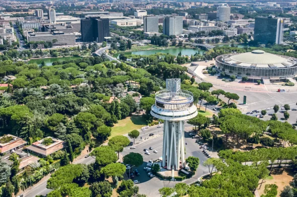 EUR is a district in the southern part of Rome. Originally conceived during the fascist era, it was intended to host the Universal Exposition in Rome, planned for 1942 but never realised due to the outbreak of war.