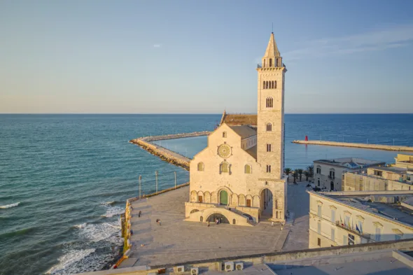 Nella luce dell’alba e del tramonto, la Cattedrale di Trani sembra una visione. La sua facciata di pietra bianca – splendido esempio di stile romanico pugliese – riflette la luce del sole e si rispecchia a sua volta nelle acque dell’Adriatico. Oltre alla chiesa, è possibile visitare la cripta e l’ipogeo e salire gli oltre 200 gradini del campanile, alto 59 metri, per una vista mozzafiato sulla città.