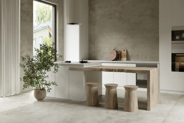 Scegli forni, frigoriferi, lavastoviglie e piani cottura che abbiano un design integrato, in modo che si adattino perfettamente al resto dell’arredamento senza risultare troppo invadenti. Per quanto riguarda gli accessori, opta per oggetti funzionali ma dal design semplice, come posate, tazze e piatti minimalisti. Mantenere un ordine visivo negli accessori, senza sovraccaricare la cucina di oggetti, è essenziale per preservare il look pulito e moderno.