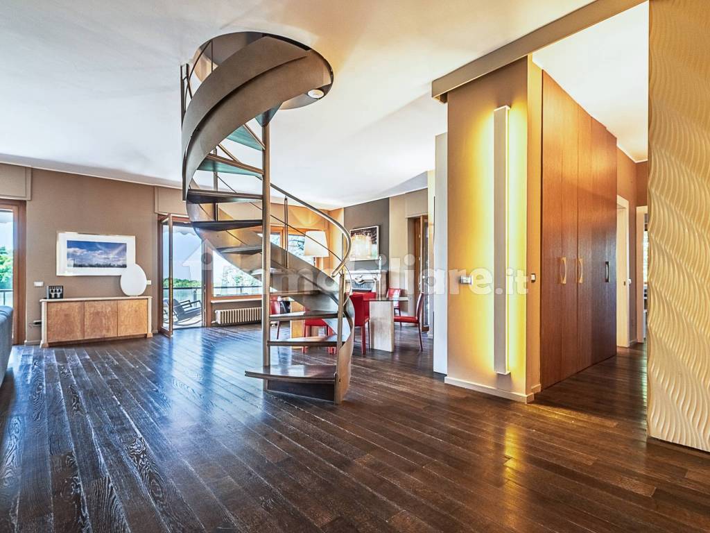 The living room features a bright corner living room with a fireplace and two spacious terraces with beautiful views of the shared park. The eat-in kitchen opens onto another balcony, a hallway furnished with numerous custom-built wardrobes, a bathroom used as a laundry room and ironing room, another bathroom with a window and shower, two double bedrooms, and a master bedroom with an ensuite bathroom with a window (240 cm shower). All bedrooms open onto another terrace overlooking the shared pool. A comfortable, designer elliptical staircase leads to the attic level (with independent access from the stairwell), complete with custom-made furnishings and numerous attic storage spaces. The attic comprises a small living room/study, a bedroom, and a bathroom with a window.