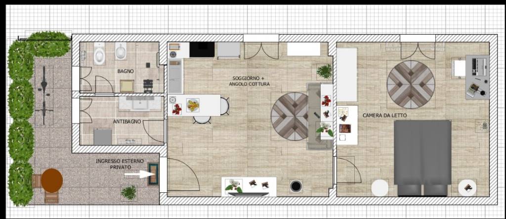 The property is air conditioned and has an independent entrance, a comfortable living room with kitchenette, a double bedroom, a bathroom and an anteroom.