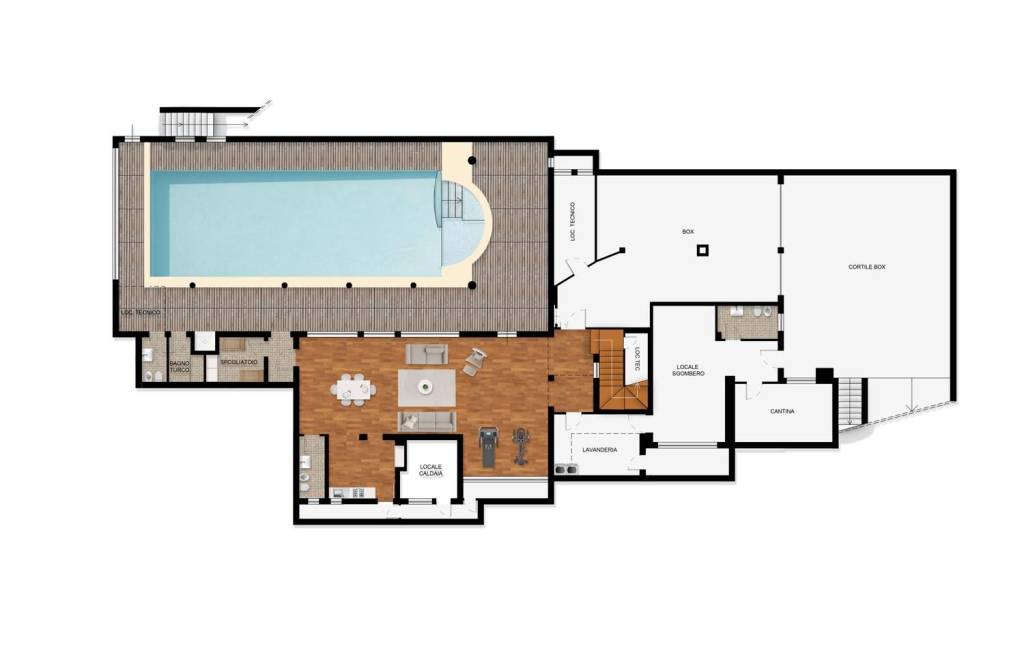 Il piano seminterrato rappresenta il vero cuore del benessere: una meravigliosa piscina coperta, interamente fruibile tutto l’anno, accompagnata da spogliatoio, servizi dedicati e un rilassante bagno turco. Completa questo livello una spaziosa taverna, perfetta per piacevoli momenti conviviali, oltre a lavanderia e locale tecnico.
