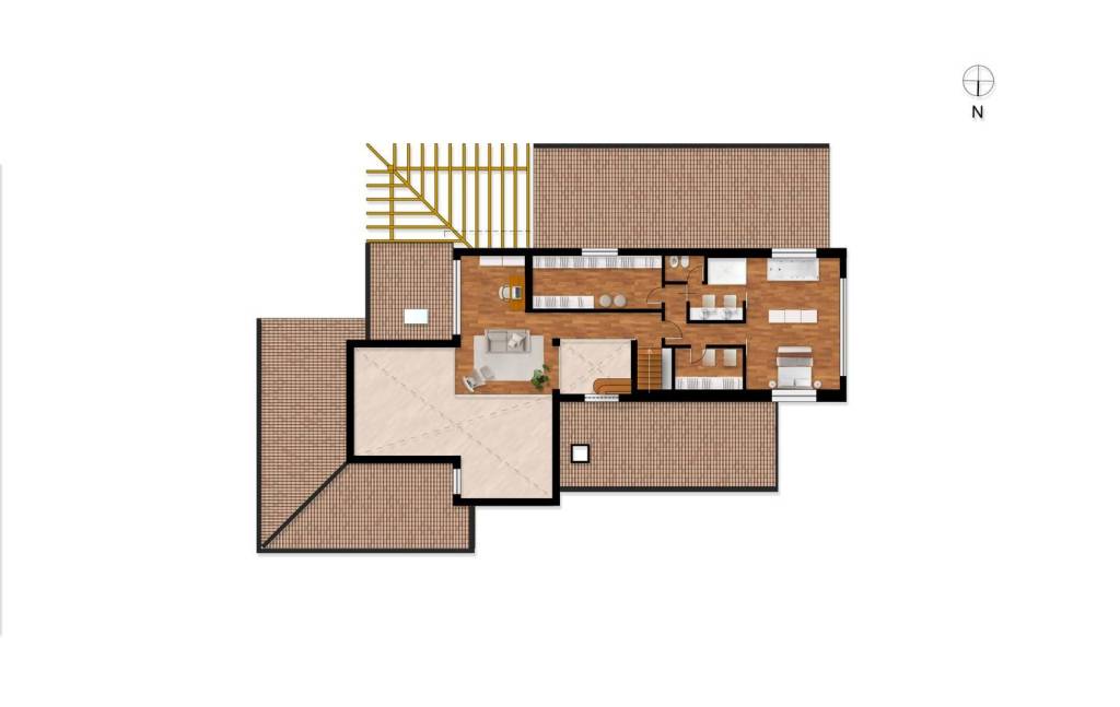Al piano primo la zona notte comprende una splendida suite padronale dotata di bagno privato, due funzionali cabine armadio e uno studio perfettamente illuminato, ideale come angolo lavoro o lettura.