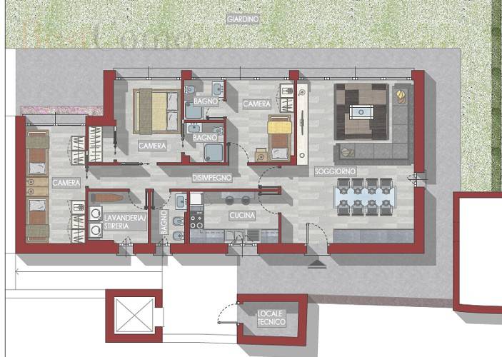 Ingresso, salotto con ampie finestre, soggiorno/area pranzo, ampia cucina, terrazzo, giardino privato, camera matrimoniale con bagno e guardaroba, camera da letto singola con bagno, camera doppia. lavanderia, bagno per gli ospiti, locale tecnico.